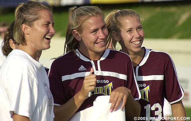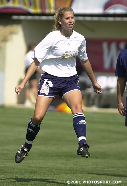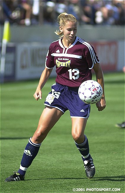 She finally got her chance against the Power, in a game in which all of the US National Team members and most of the internationals were away in tournaments. Though she's an attacking midfielder, she played defense in her first WUSA start. In her new role in the back, she immediately set up a Shannon MacMillan goal. Spirit coach Carlos Juarez liked what he saw, enough that Maggs has played defense in every game since, starting the entire last half of the season while the Spirit, which had been stuck at the bottom of the table, made an impressive run at the playoffs. The 5'9" Maggs is the second-highest scorer in history at UConn and knows how to find the back of the net if she gets the chance, even in her new role as a defender. What she is not used to is playing without her sister -- but that does give fans on both coasts the chance to watch at least one of the talented Tietjen twins every week. Maggs' Stats (2001 WUSA season)